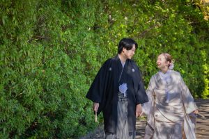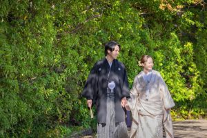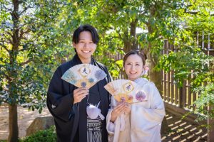 白無垢と黒紋付という伝統的な装いで、