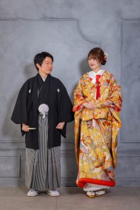 色打掛と紋付袴姿に身を包んだおふたり。