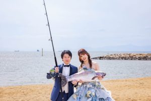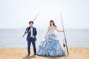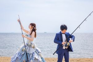 ドレス姿で釣り竿を持つ花嫁様。